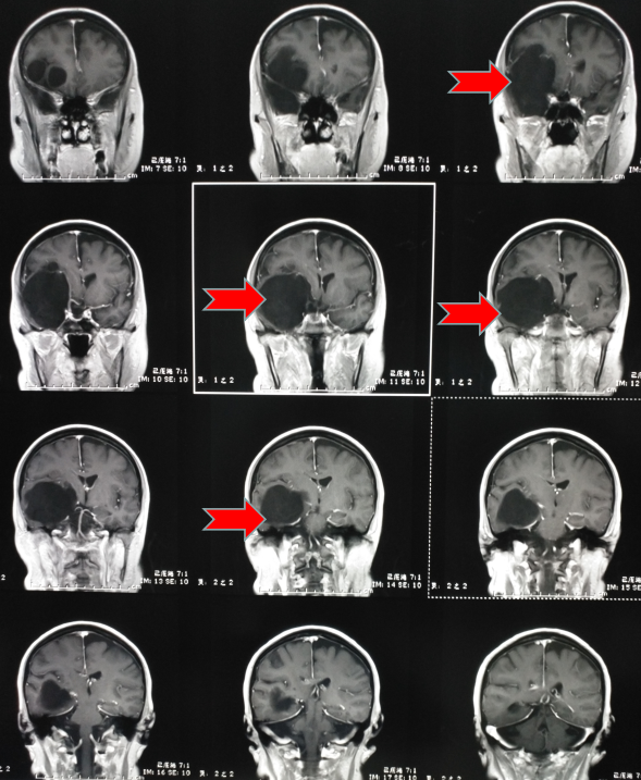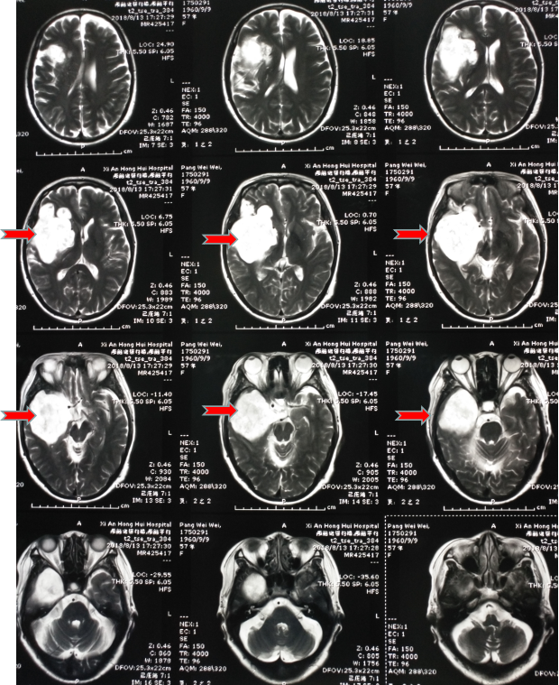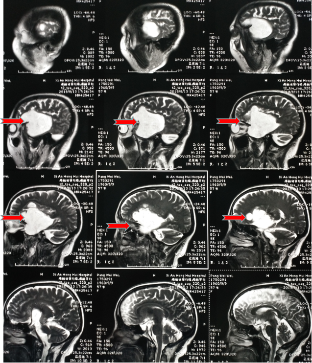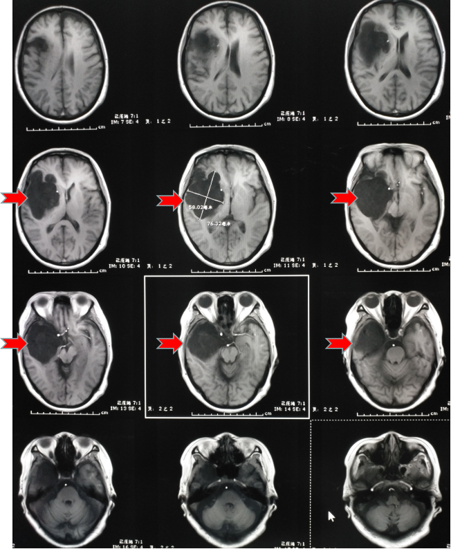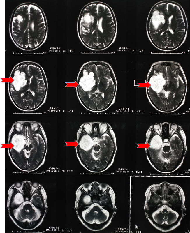 第二天趕緊到醫(yī)院看了一下,醫(yī)生說這是癲癇,隨后給她開了“丙戊酸鈉”長期口服,用藥后仍然每年有1-2次發(fā)作,大多是在晚上,有時(shí)即使沒有發(fā)生四肢抽搐,但有一種異樣的感覺。雖然這兩年很少發(fā)作了,但異樣感覺一直存在。今年她順利退休了,但教師的職業(yè)病——頸椎病卻讓他頸肩部以及上肢經(jīng)常麻木酸困,所以查了一下磁共振,確實(shí)存在頸椎病,但不需要手術(shù),只需保守治療即可。但意外的是發(fā)現(xiàn)了腦子里面長了個(gè)瘤子,大小約7厘米。